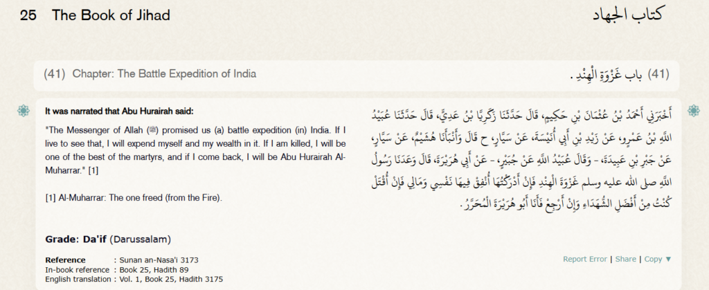 इस हदीस में हज़रत अबू हुरैरा (R.A.) के माध्यम से भारत पर आक्रमण के वादे का जिक्र है।